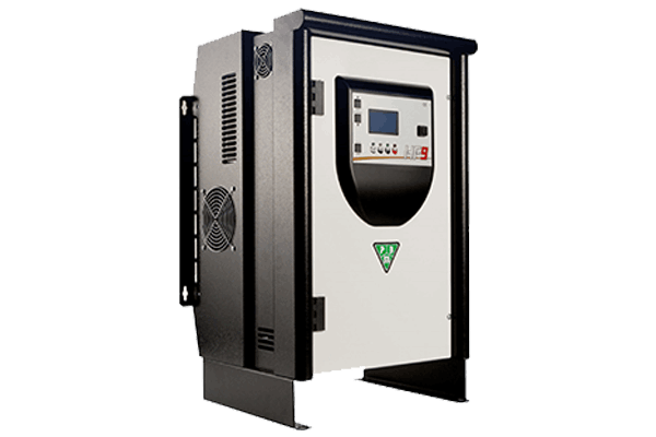 Cargador de batería con tarjeta DISPLAY. Posibilidad de accesorios externos, recarga y señalización remota, puerto USB con memoria de los últimos 800 ciclos de carga.